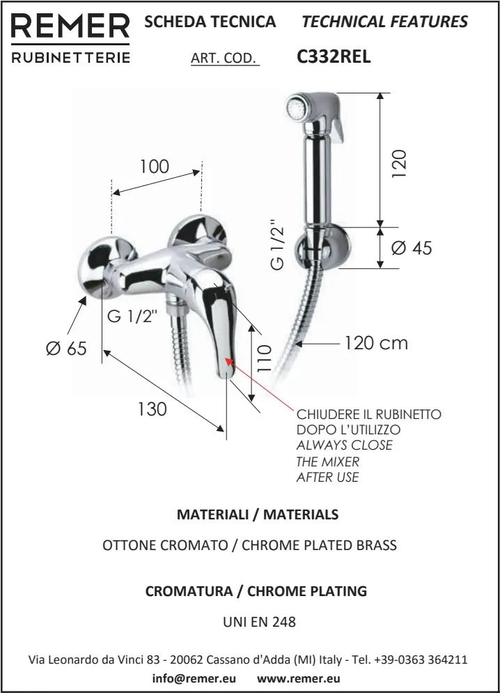 Итальянский бренд Remer Rubinetterie более 50 лет специализируется на выпуске смесителей, душевых систем и аксессуаров для ванной комнаты и кухни. Главная особенность продукции Remer — сочетание классического итальянского дизайна и современных технологий. В отличие от многих конкурентов, компания выпускает полный цикл изделий: от литейного производства латунных корпусов до хромирования и финальной сборки. Это обеспечивает стабильное качество, долговечность и оптимальную цену для европейской сантехники премиум-класса.