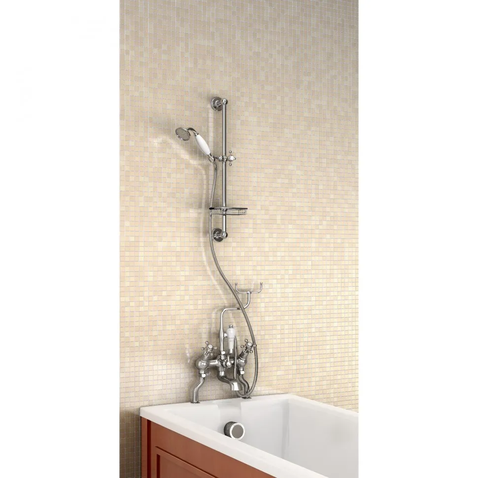 ; Элегантная и лаконичная душевая стойка состоит из смесителя, выполненного под небольшим углом, ручного душа и мыльницы-решетки. Она способна превратить принятие душа в настоящий праздник.;