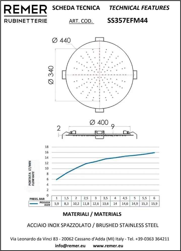 Верхний душ Remer потолочный Ø 44см нержавеющая сталь SS357EFM44