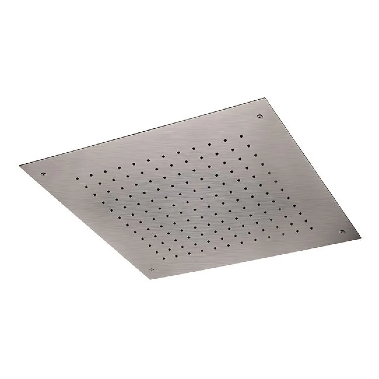 Ceiling shower head in brushed stainless steel, anti-limescale jets, 50x50 cm, with rain jet.