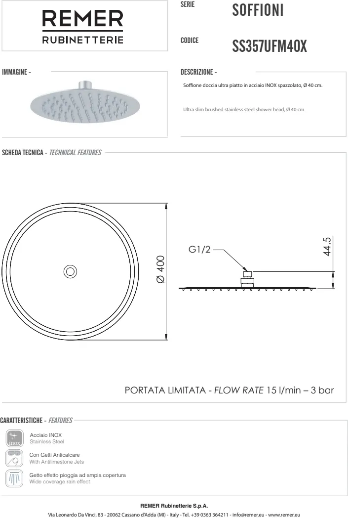 Верхний душ Remer с шарнирным соединением Ø 40см нержавеющая сталь SS357UFM40X