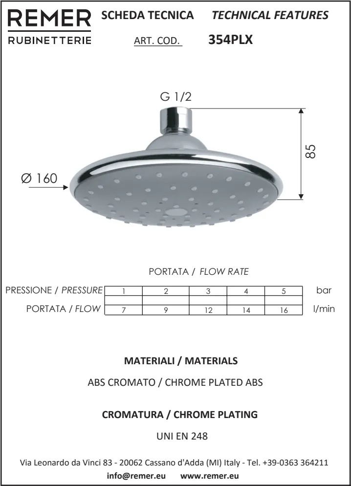 Верхний душ Remer с шарнирным соединением Ø 16см хром (CR) пластик 354PLX