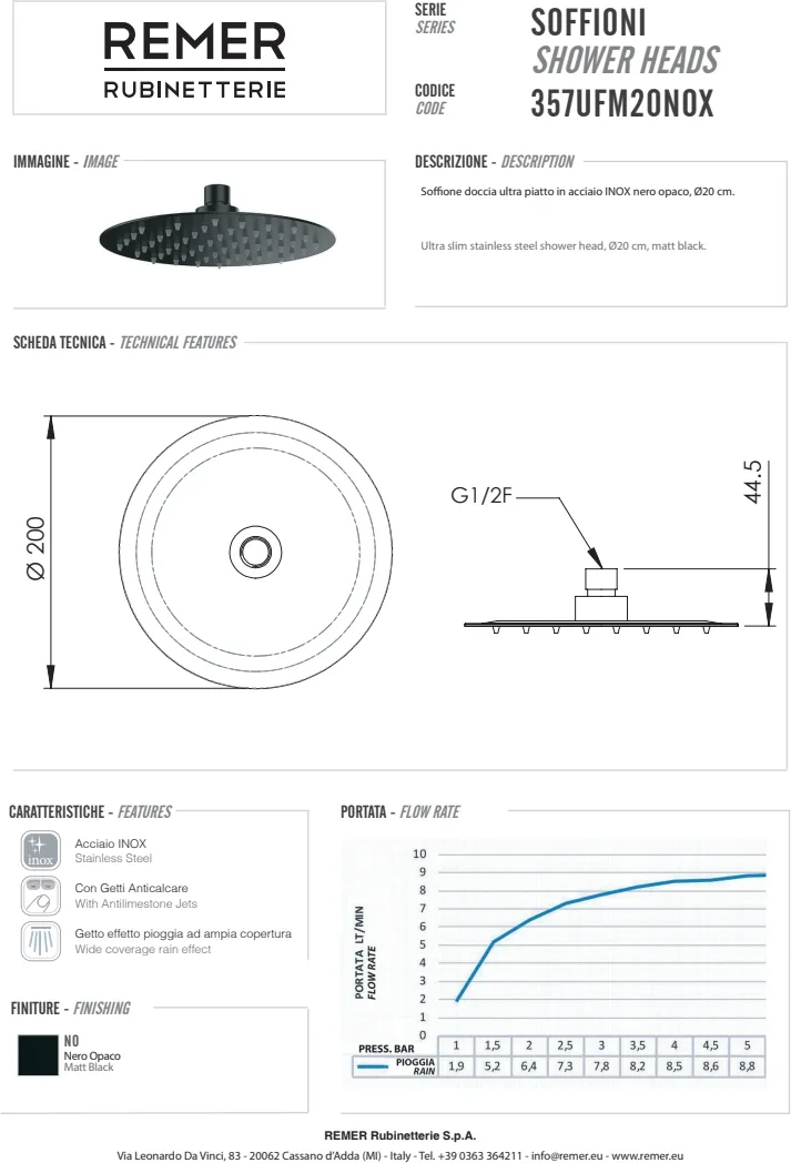 Верхний душ Remer с шарнирным соединением Ø 20см черный матовый (NO) 357UFM20NOX