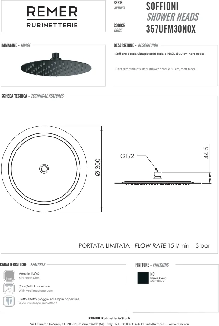 Верхний душ Remer с шарнирным соединением Ø 30см черный матовый (NO) 357UFM30NOX