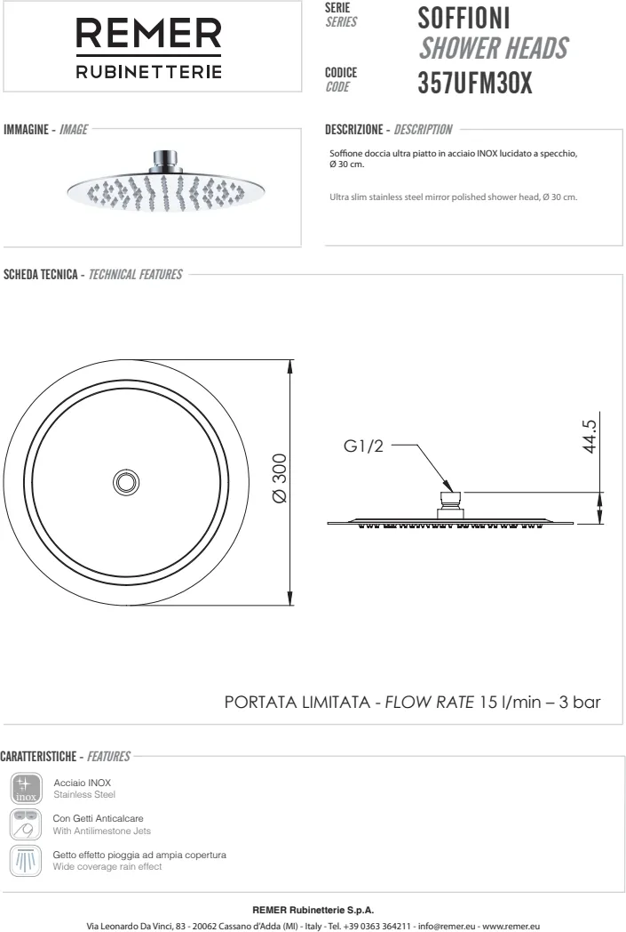 Сверхтонкая душевая головка из нержавеющей стали с зеркальной полировкой, Ø30 cm._ Ø20 cm. with code 357UFM20X_ Ø25 cm. with code 357UFM25X_ Øx40 cm. with code 357UFM40X
