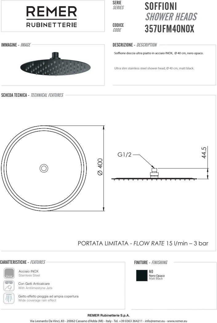 Верхний душ Remer с шарнирным соединением Ø 40см черный матовый (NO) 357UFM40NOX