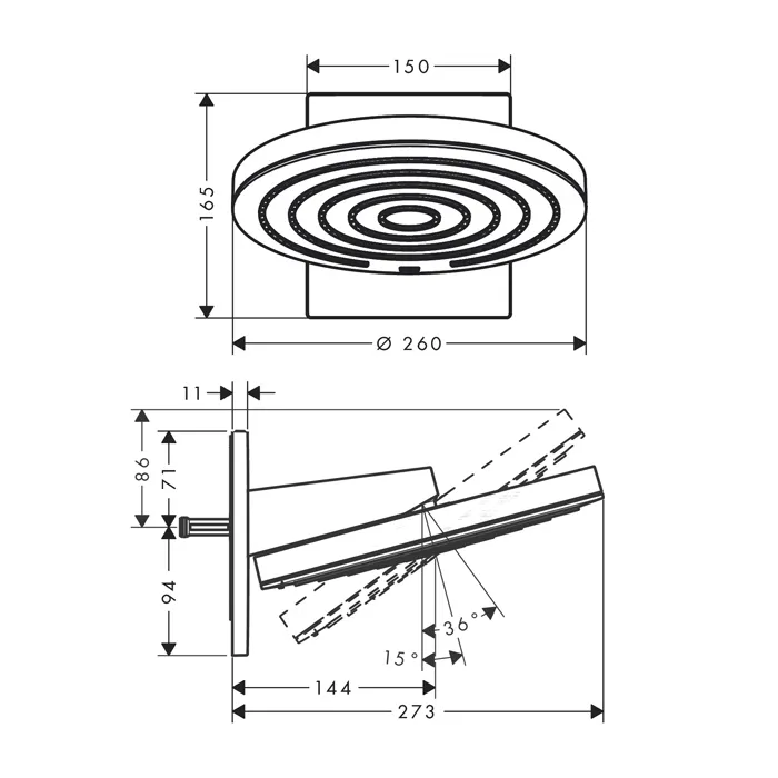 HANSGROHE PULSIFY Верхний душ Ø260 мм., с настенным креплением, 2 режима, внешняя часть(для монтажа требуется Ibox), цвет хром/графит
