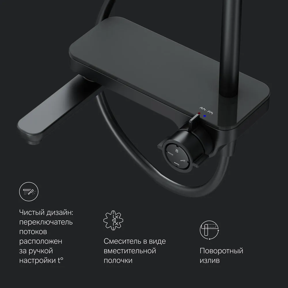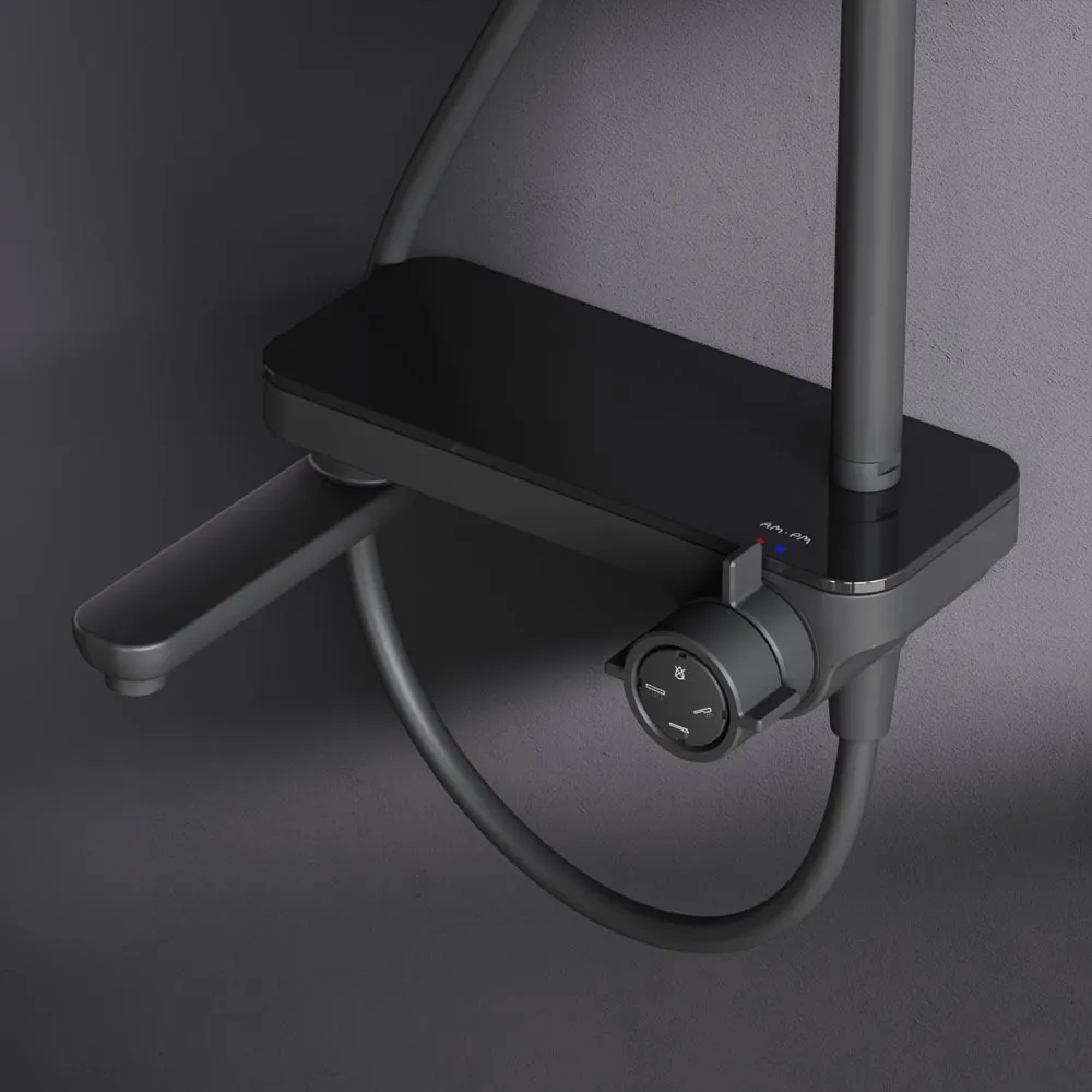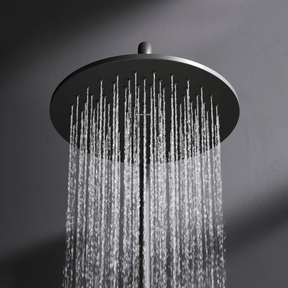 Тотальный дизайн в действии: все детали душевой системы – от пропорций ручного и верхнего душей до рисунка расположения форсунок на лейках.