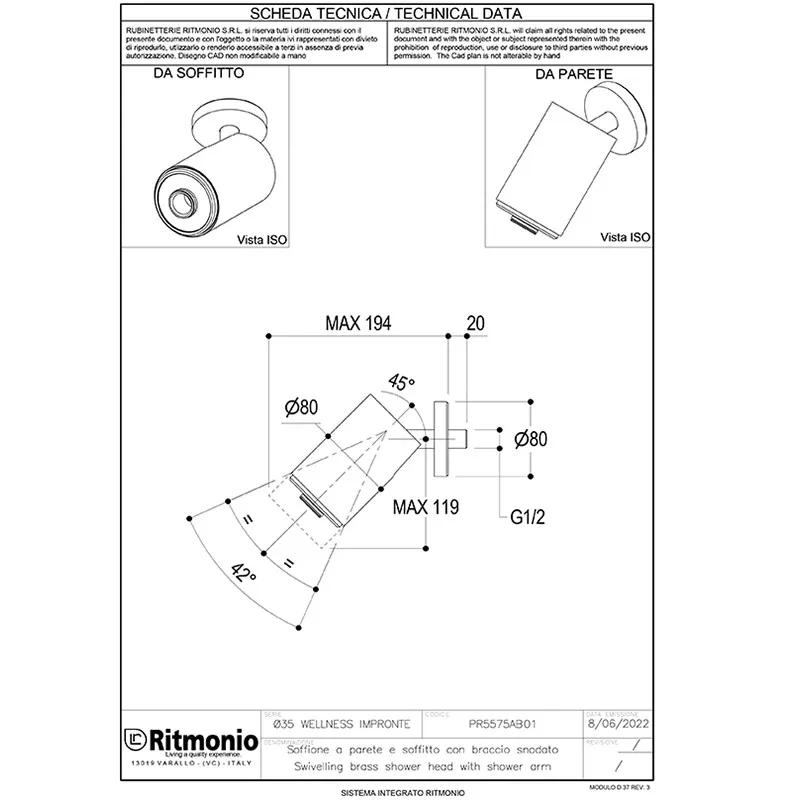 Верхний душ Ritmonio Diametro35 Wellness Impronte регулируемый поворотный корпус хром PR5575AB01CRL