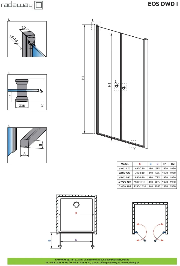 Коллекция Eos очень популярная из-за своей практичности. Широкий модельный рад и доступная цена это основные плюсы этой коллекции. В душевых кабинах Eos дверь открывается как наружу, так и внутрь.Кроме моделей с обычной распашной дверью, есть кабины со складывающейся дверью (bifold)и двустворчатой дверью. Все модели возможно установить как на поддоне, так и непосредственно на пол. Все модели возможно установить без планки порога. В таком случае нижний горизонтальный уплотнитель будет размером выше. Просим при заказе указывать нужный вариант исполнения. Цена кабины без порога и с высоким уплотнителем остается без изменений.