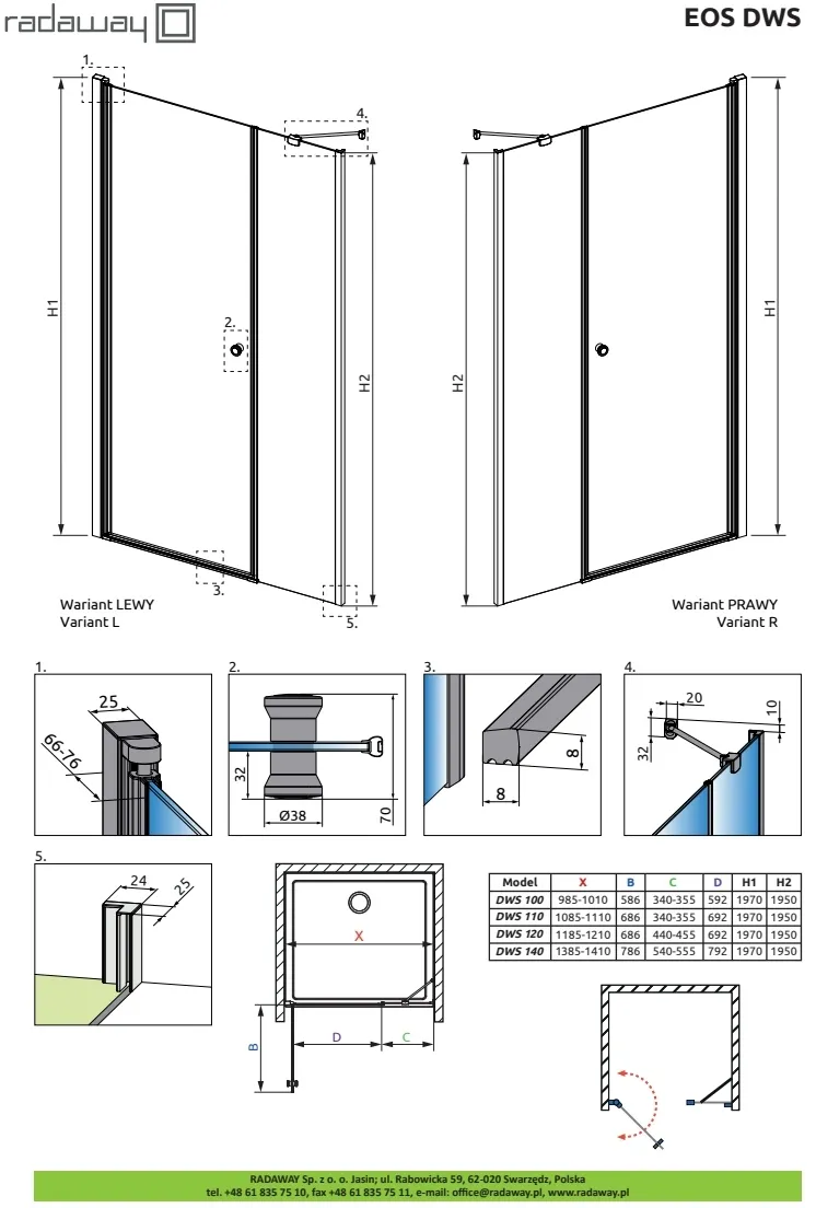 Коллекция Eos очень популярная из-за своей практичности. Широкий модельный рад и доступная цена это основные плюсы этой коллекции. В душевых кабинах Eos дверь открывается как наружу, так и внутрь.Кроме моделей с обычной распашной дверью, есть кабины со складывающейся дверью (bifold)и двустворчатой дверью. Все модели возможно установить как на поддоне, так и непосредственно на пол. Все модели возможно установить без планки порога. В таком случае нижний горизонтальный уплотнитель будет размером выше. Просим при заказе указывать нужный вариант исполнения. Цена кабины без порога и с высоким уплотнителем остается без изменений.