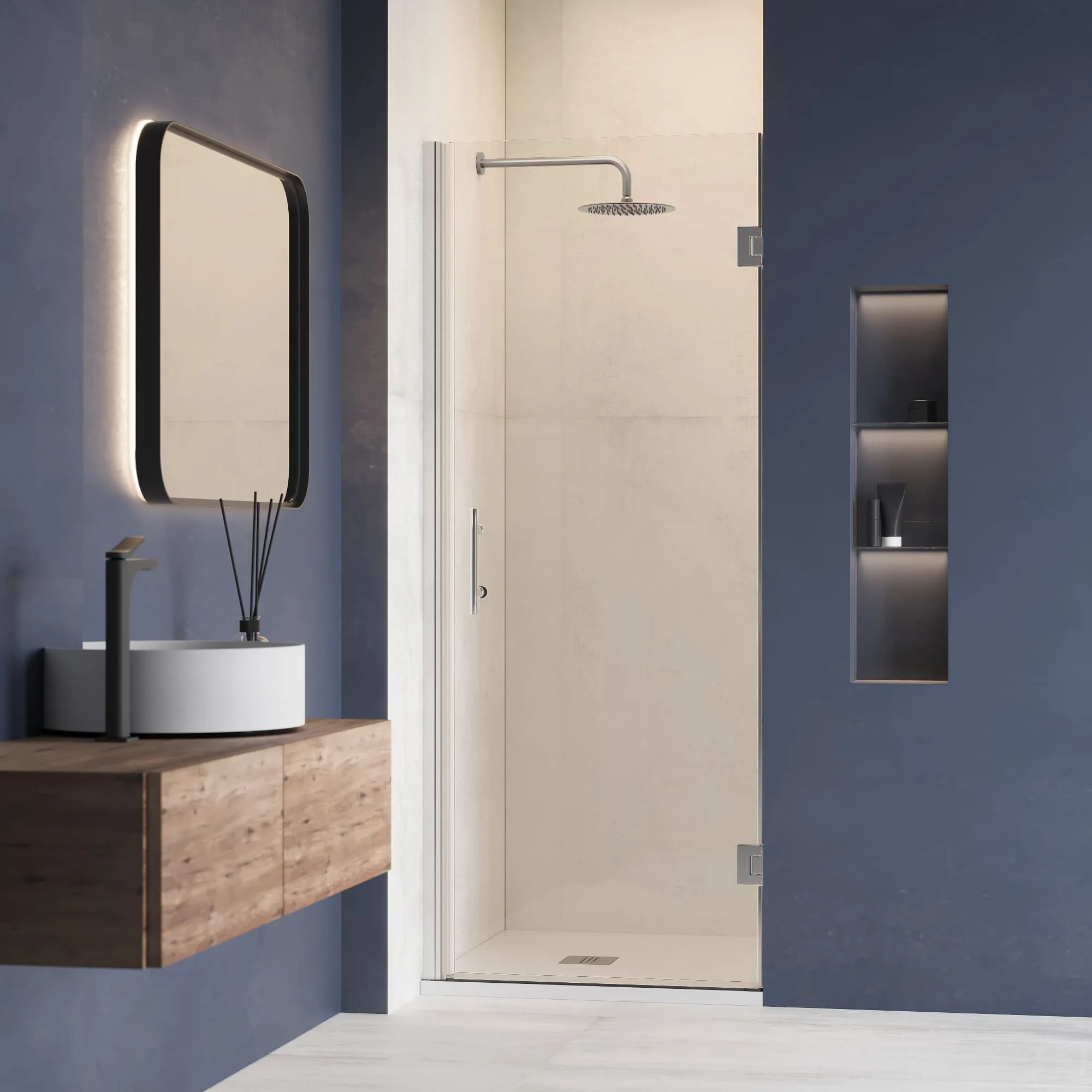 Цвет хромированного профиля идеально дополняет стекло, создавая элегантный и современный вид. Водонепроницаемые стальные петли гарантируют, что дверь не будет протекать, обеспечивая водонепроницаемое уплотнение и предотвращая утечку воды из душевой зоны.