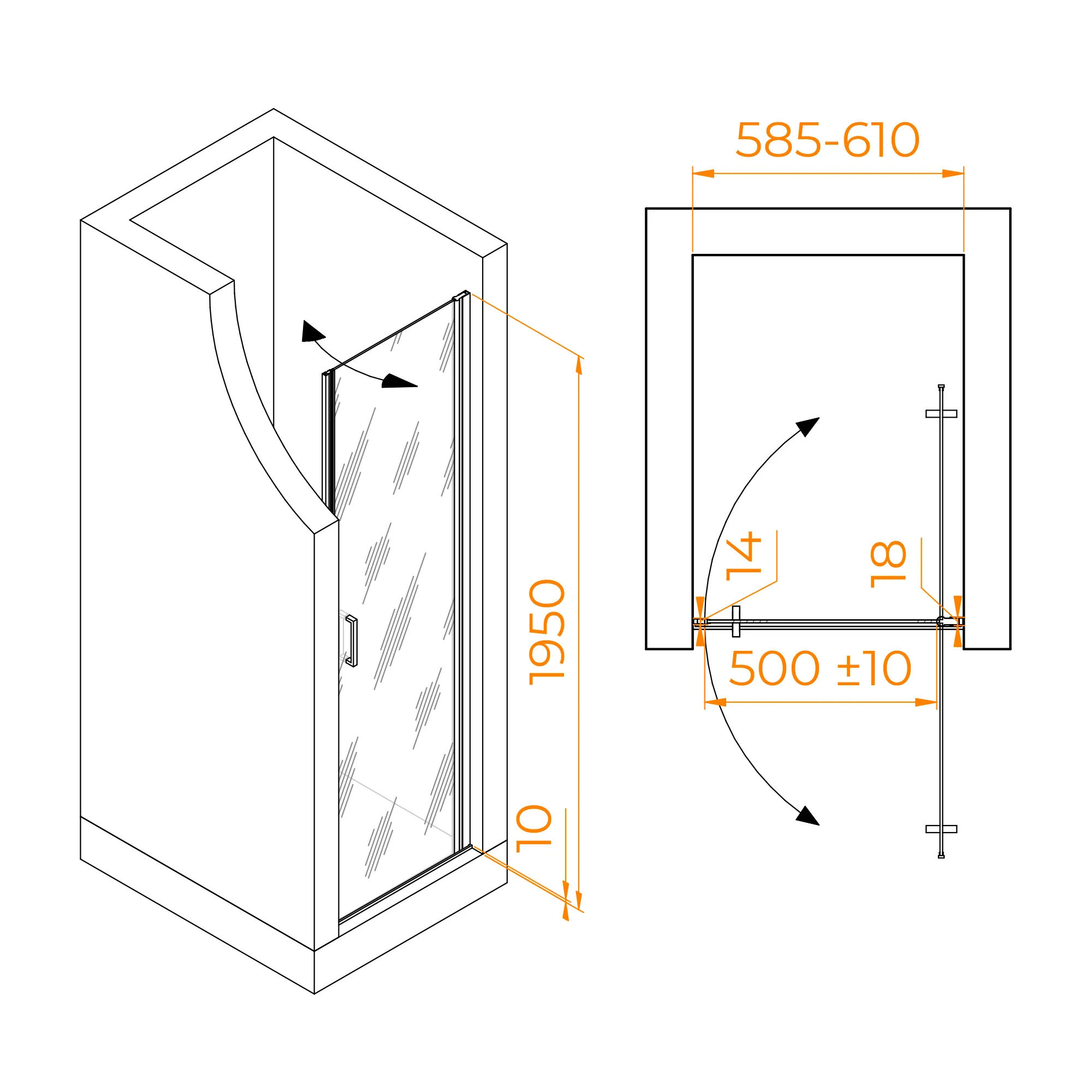 Душевая дверь изготовлена из стекла толщиной 6 мм, обеспечивающего превосходную прочность и долговечность. Прозрачный цвет стекла создает современный и открытый вид, а хромированный цвет профиля добавляет нотку элегантности. Общая высота двери составляет 1950 мм, что делает ее подходящей для большинства стандартных душевых кабин.