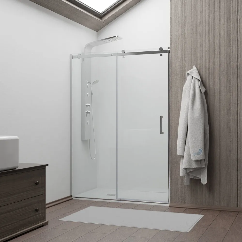 Общая высота двери составляет 1950 мм, позволяя ей легко пропускать даже самых высоких людей. Конструкция раздвижных дверей делает использование двери удобнее и экономит место в ванной комнате. Двойные ролики плавно и бесшумно открывают и закрывают дверь.