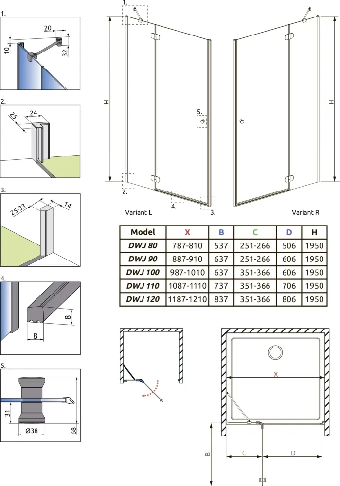 - стандартные душевые двери доступны в прозрачном стекле. По спец-заказу доступны кабины как в нестандартных, так и стандартных размерах в (02) сатиновом, (05) графитовом и (08) коричневом цветах а также в сверх-прозрачном стекле UltraClear
