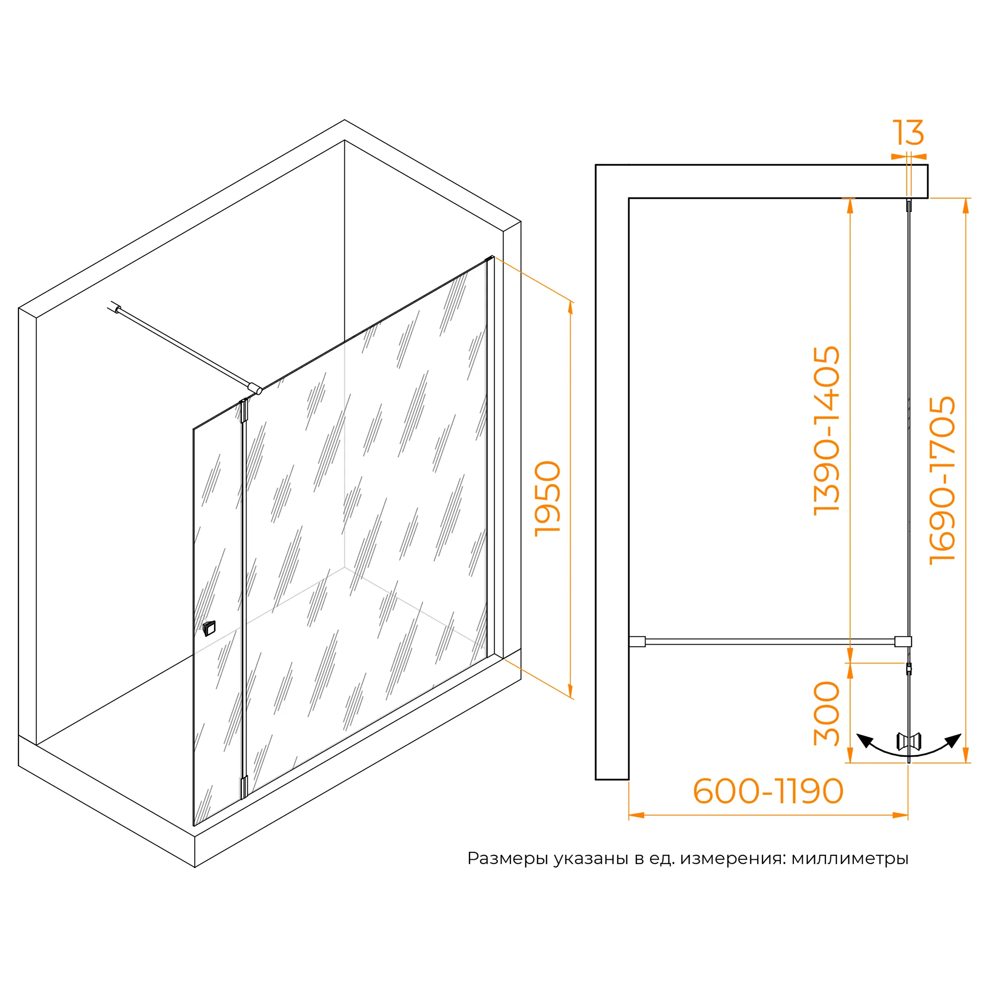 Душевая перегородка состоит из стационарного полотна и полотна с поворотной маятниковой частью - 300 мм. Стационарное стекольное полотно крепится к стене алюминиевым профилем с декоративной заглушкой. Подвижное полотно закреплено стальной маятниковой петлей с ходом 180 градусов.