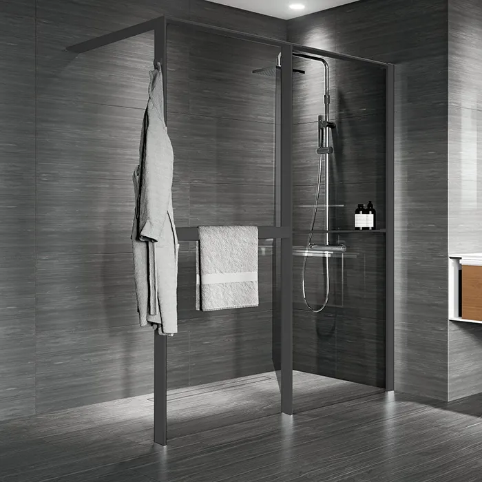 Душевое ограждение Novellini Kuadra Hwz1 1740-1770х2000, с свободным входом, правое, с полкой и полотенцедержателем, стекло прозрач, проф черн мат, KUADHWZPOS180D-1H