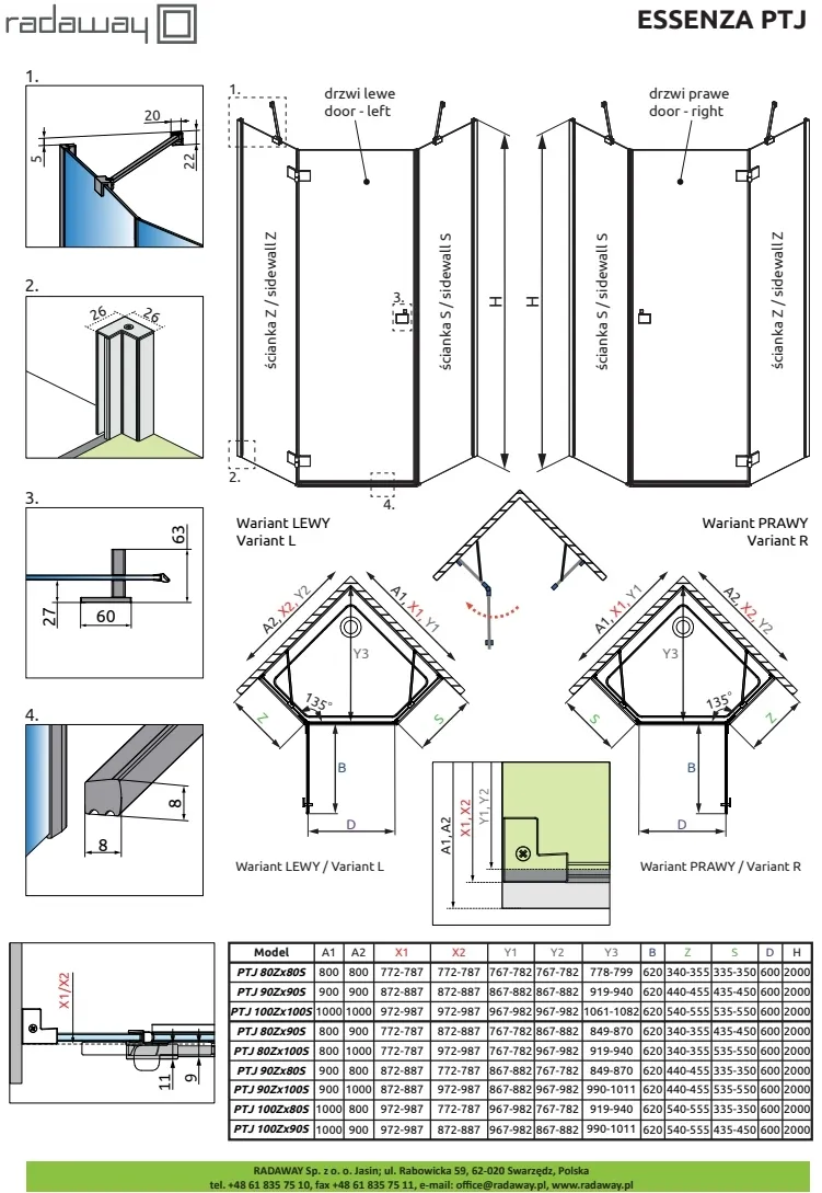 Essenza PTJ — пятиугольная душевая кабина с одностворчатой распашной дверью.