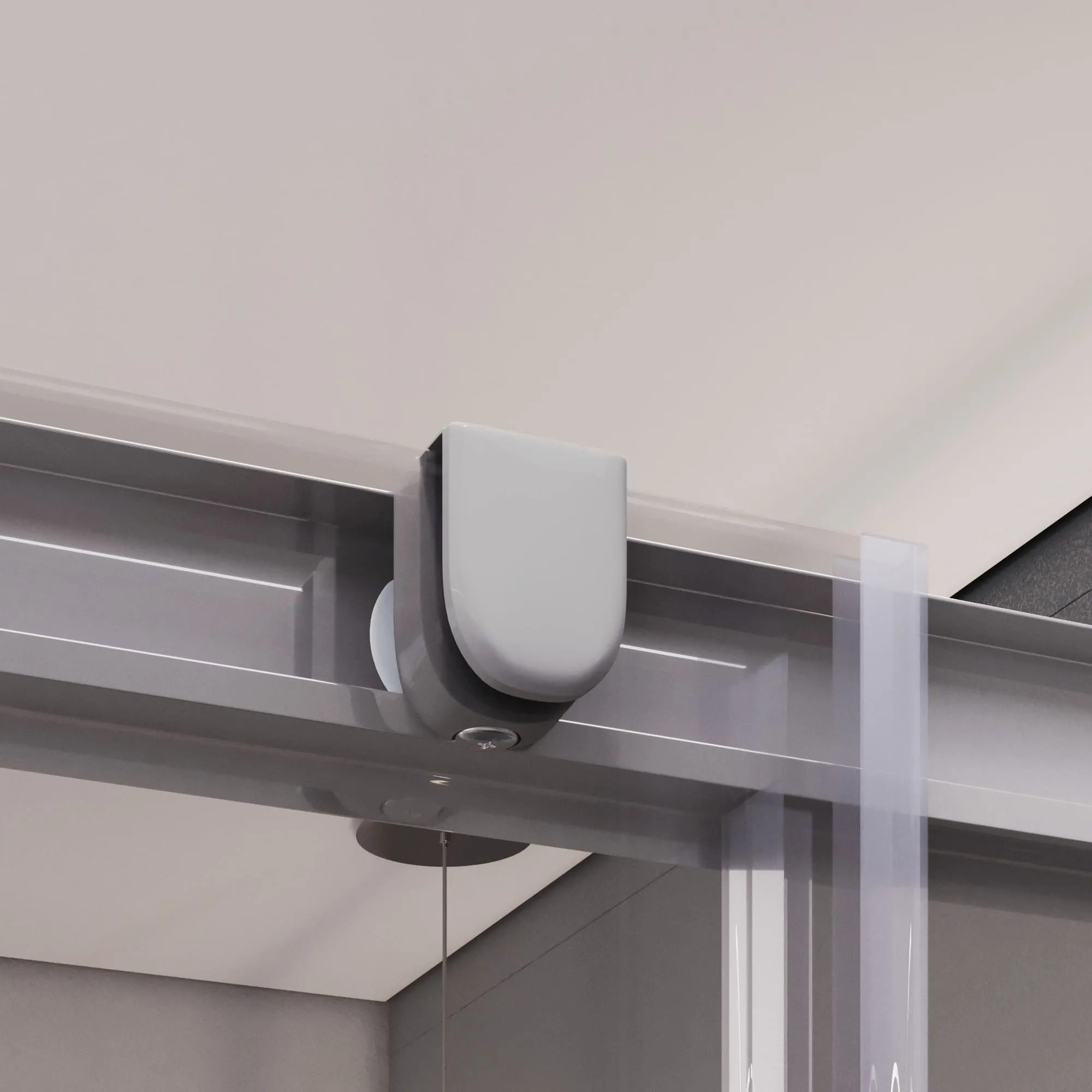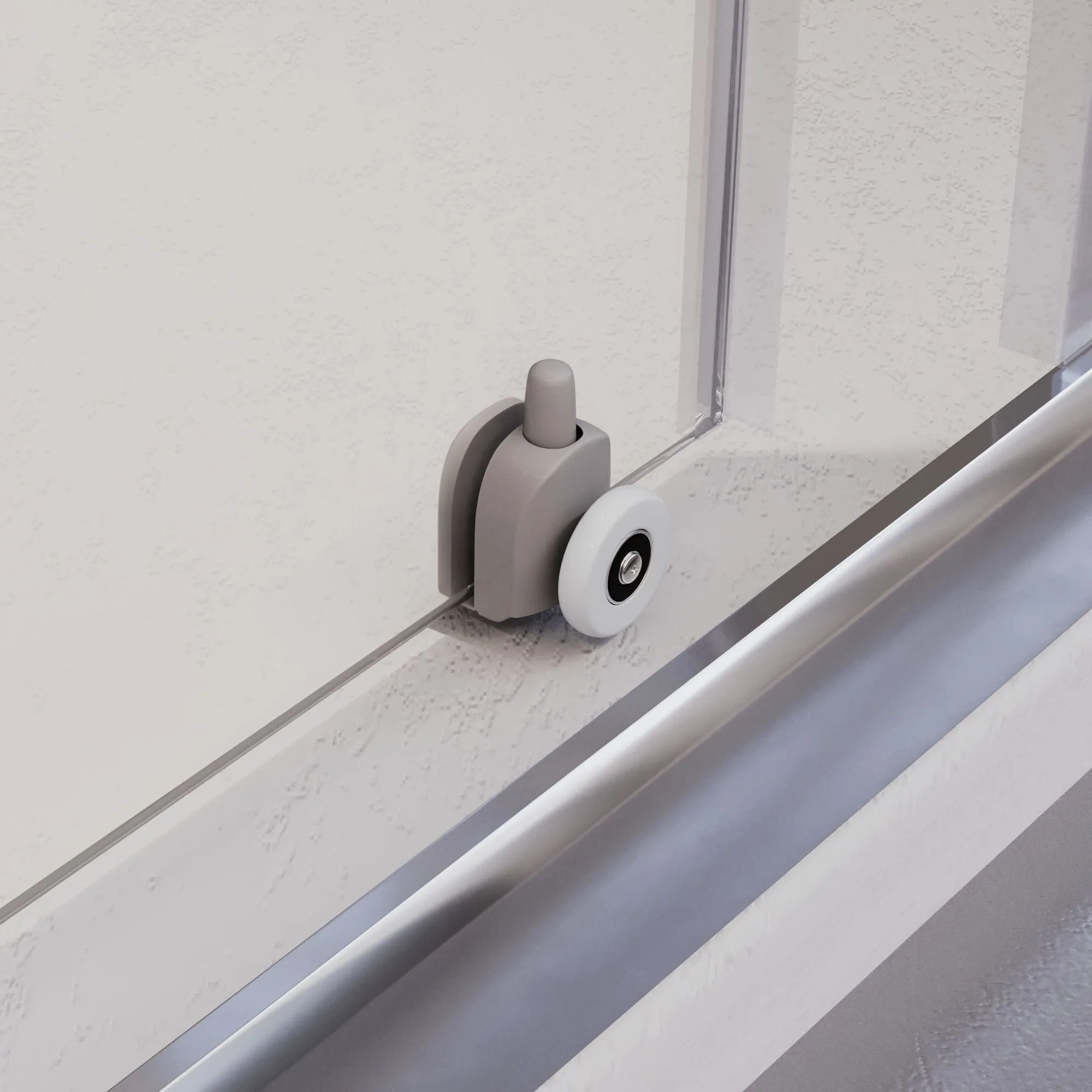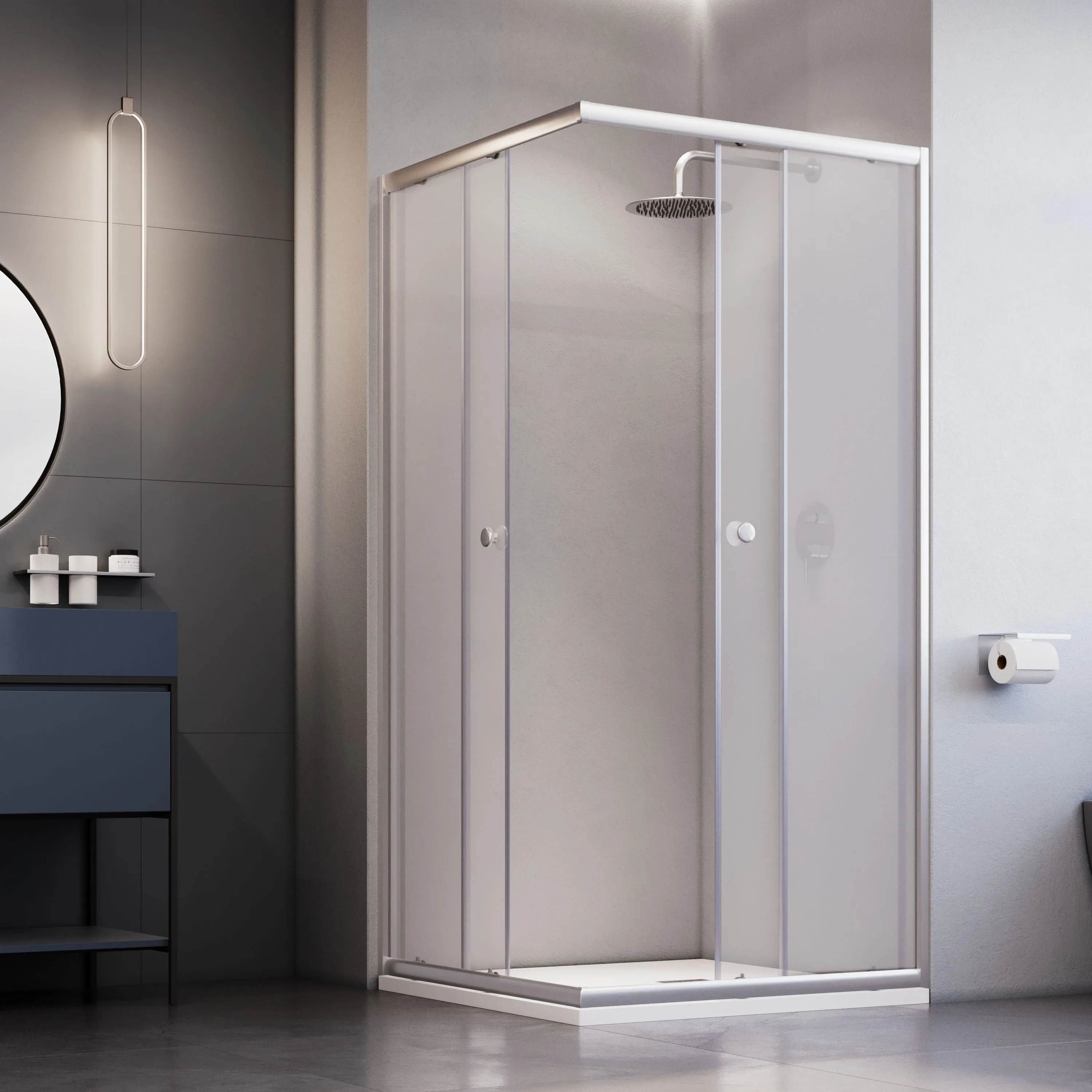 Бюджетный душевой уголок из стекла с раздвижными дверьми в профиле шириной 4 см образует квадратную душевую зону со входом с угла. Стеклянный уголок, ограждающий водяной поток, состоит из двух – стационарных полотен и двух раздвигающихся полотен «Дверь», которые установлены на ролики. При открытии двери плавно сдвигаются, раскрывая широкий вход с угла.