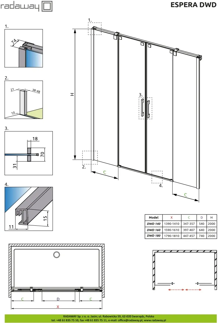 Коллекция Espera это набор кабин и дверей в нишу которые отличаются надежностью и стилем.Espera создана для употребителей, которые точно знают чего хотят от жизни.Коллекция получила несколько призов от читателей разных журналов. Все изделия из этой коллекции допускается устанавливать как на поддон так и непосредственно на пол. Кроме того, все изделия допускается устанавливать с порогом или без порога меняя нижний фиксатор (в комплекте).