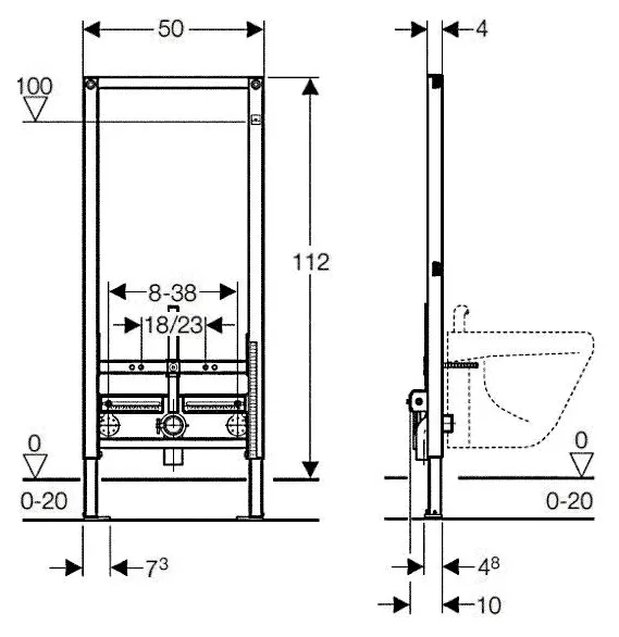 Монтажная рама для подвесного биде. Система инсталляции полностью готова к установке в гипсокартонной перегородке, либо перед капитальной стеной и состоит из стальной рамы (самонесущая конструкция) с порошковым покрытием синего цвета. Диапазон регулирования инсталляции по высоте - 200мм с помощью оцинкованных самостопорящихся опор для выравнивания элемента без применения инструментов с метками позволяет установить максимально удобную высоту биде от пола. Межосевое расстояние между крепежными шпильками (М12) для крепления биде 180 мм или 230 мм. В комплект поставки входит фановый отвод диаметром 50 мм и резиновая манжета диаметром 44/32 мм. Инсталляция поставляется упакованной в картонную коробку без крепежных элементов (111.815.00.1).
