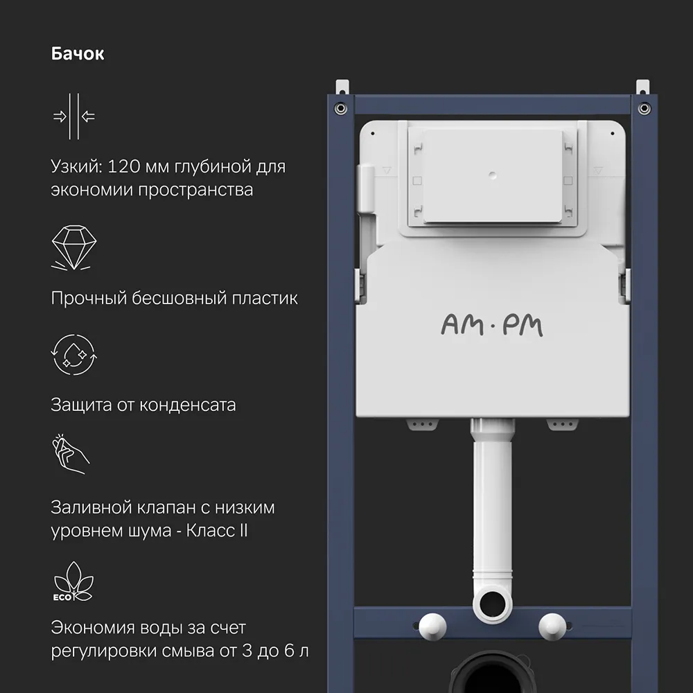 Максимально полный комплект поставки включающий все необходимые крепления патрубки звукоизолирующую прокладку. Экономия пространства благодаря узкому бачку – 120 мм глубиной. Заливной клапан с низким уровнем шума - Класс II согласно европейского стандарта EN 14124.