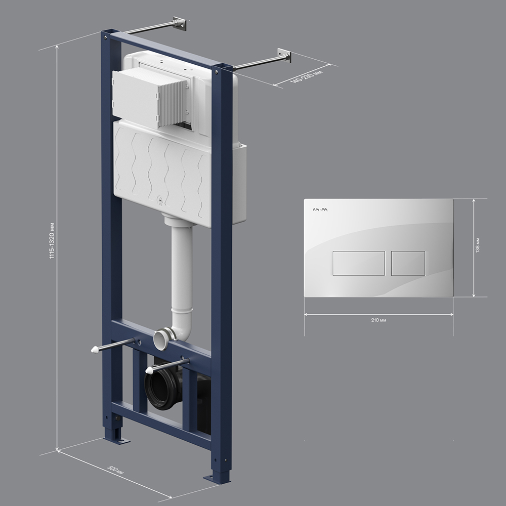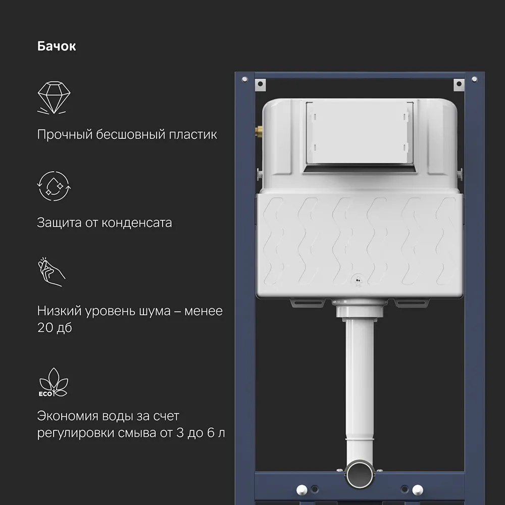 Максимально полная комплектация - все необходимые крепления патрубки звукоизолирующая прокладка в комплекте. Вертикальные ребра жесткости в конструкции рамы – дополнительная опора в месте давления керамики на стену. Благодаря им инсталляция более универсальная и подходит для унитазов любых размеров включая унитазы с небольшой контактной поверхностью. Нет необходимости докупать дополнительные аксессуары для монтажа таких унитазов.