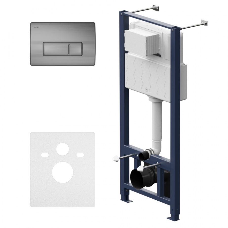 Максимально полная комплектация - все необходимые крепления патрубки звукоизолирующая прокладка в комплекте. Вертикальные ребра жесткости в конструкции рамы – дополнительная опора в месте давления керамики на стену. Благодаря им инсталляция более универсальная и подходит для унитазов любых размеров включая унитазы с небольшой контактной поверхностью. Нет необходимости докупать дополнительные аксессуары для монтажа таких унитазов.