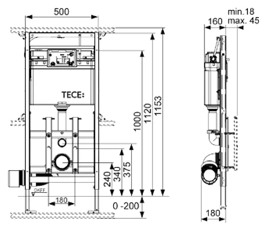 Монтажный элемент для монтажа в конструкцию из профиля TECEprofil или для установки в металлических или деревянных стоечно-балочных конструкциях. Также для пристенного или углового монтажа. Для стеклянной панели TECElux с сенсорным или механическим блоком управления. С возможностью ручной регулировки высоты до 8 см. Полностью собран, состоит из: Смывной бачок TECE: - Объем бачка — 10 литров; Установлен стандартный объем большого смыва — 6 литров, также возможна установка объема большого смыва 9/7,5/4,5 литров; Объем малого смыва — 3 литра. Остаточный объем воды для досмыва - В изоляции для предотвращения образования конденсата - Протестирован согласно DIN EN 14055 - Группа фитингов 1 согласно DIN 4109 - Заливной клапан с низким уровнем шума - С контейнером для гигиенических таблеток. Позволяет загружать гигиенические таблетки в бачок для освежения смыва; - Бачок изготовлен из ударопрочного пластика - Полностью собран и опечатан - Заливной угловой вентиль смонтирован - Подключение к системе водоснабжения с внутренней резьбой 1/2". Модуль: - Две крепежные шпильки и гайки M 12 - Установочное расстояние для унитаза 180 мм - Гибкий фановый отвод DN 90 из PE-HD (свариваемый), включая переходник DN 90/100 из полипропилена - Комплект патрубков для подсоединения унитаза DN 90, включая защитные заглушки - Высокоэффективная защита внутренних пространств конструкции - Подходит для стен с толщиной чистовой отделки до 45 мм - Размеры (В x Ш x Г): 1120 x 500 x 180 мм - Прочная монтажная рама окрашенная порошковой краской - Регулируемые по глубине направляющие для верхней стеклянной панели с блоком управления приводом и нижней стеклянной панели, с возможностью ручной регулировки высоты - Две регулируемые в диапазоне 0-200 мм опоры для крепления к полу Дополнительно приобретается: - Крепежные элементы для установки перед стеной, угловой установки или установки в деревянные стоечно-балочные конструкции Дополнительные принадлежности (опционально): система очистки воздуха TECElux ceramic-Air (9660000), только в сочетании с верхней стеклянной панелью sen-Touch с сенсорным блоком управления - Верхняя стеклянная панель с блоком управления - Нижняя стеклянная панель для установки унитазаЗагрузка отзывов...
