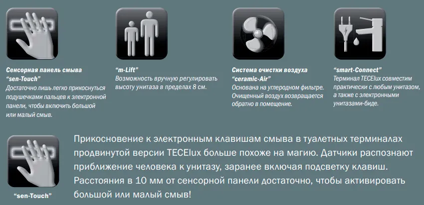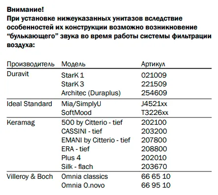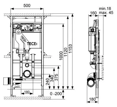 Монтажный элемент для монтажа в конструкцию из профиля TECEprofil или для установки в металлических или деревянных стоечно-балочных конструкциях. Также для пристенного или углового монтажа. Для стеклянной панели TECElux с сенсорным блоком управления. С возможностью ручной регулировки высоты до 8 см, включая систему очистки воздуха ceramic-Air. Полностью собран, состоит из: Смывной бачок TECE: - Объем бачка — 10 литров; Установлен стандартный объем большого смыва — 6 литров, также возможна установка объема большого смыва 9/7,5/4,5 литров; Объем малого смыва — 3 литра. Остаточный объем воды для досмыва - В изоляции для предотвращения образования конденсата - Протестирован согласно DIN EN 14055 - Группа фитингов 1 согласно DIN 4109 - Заливной клапан с низким уровнем шума - С контейнером для гигиенических таблеток Позволяет загружать гигиенические таблетки в бачок для освежения смыва - Бачок изготовлен из ударопрочного пластика - Полностью собран и опечатан - Заливной угловой вентиль смонтирован - Подключение к системе водоснабжения с внутренней резьбой 1/2" Модуль: - Гибкий фановый отвод DN 90 из PE-HD (свариваемый), включая переходник DN 90/100 из полипропилена - Комплект патрубков для подсоединения унитаза DN 90, включая защитные заглушки - Высокоэффективная защита внутренних пространств конструкции - Подходит для стен с толщиной чистовой отделки до 45 мм - Размеры (В x Ш x Г): 1120 x 500 x 180 мм Система очистки воздуха ceramic-Air с низким уровнем шума с фильтрующим элементом длительного срока службы - Прочная монтажная рама окрашенная порошковой краской - Регулируемые по глубине направляющие для верхней стеклянной панели с блоком управления приводом и нижней стеклянной панели, с возможностью ручной регулировки высоты - Две регулируемые в диапазоне 0–200 мм опоры для крепления к полу - Две крепежные шпильки и гайки M 12 - Установочное расстояние для унитаза 180 мм Примечание В «Технической информации» представлены унитазы, для которых невозможно установить опцию очистки воздуха. Возможна установка системы очистки воздуха ceramic-Air с большинством известных моделей унитазов. Однако, у некоторых моделей унитазов с более высоким ободом в смывном патрубке может оставаться вода. Дополнительно приобретается: - Нижняя стеклянная панель для установки унитаза - Крепежные элементы для установки перед стеной, угловой установки или установки в деревянные стоечно-балочные конструкции - Верхняя стеклянная панель с приводом sen-TouchЗагрузка отзывов...