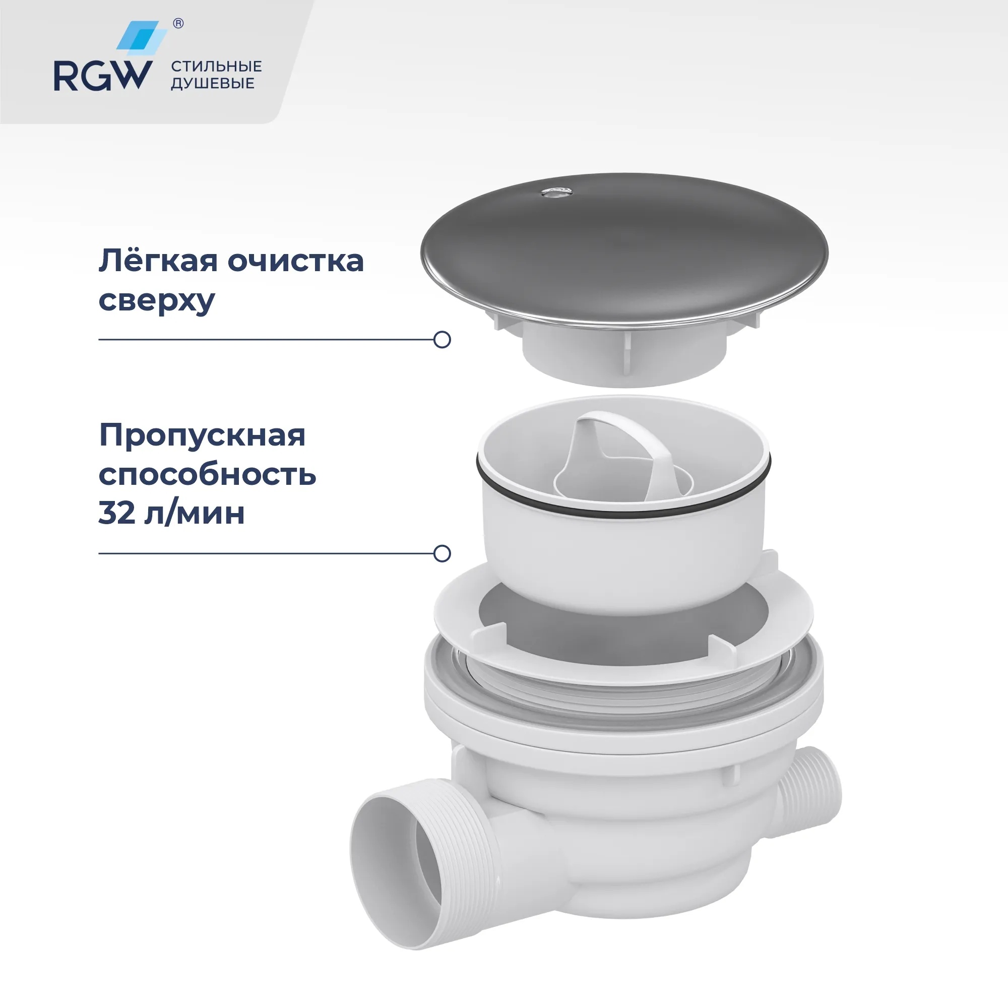 Сифон Velplex QYD-01 со съемным гидрозатвором для душевых поддонов. Верхняя крышка сифона хромированного цвета.