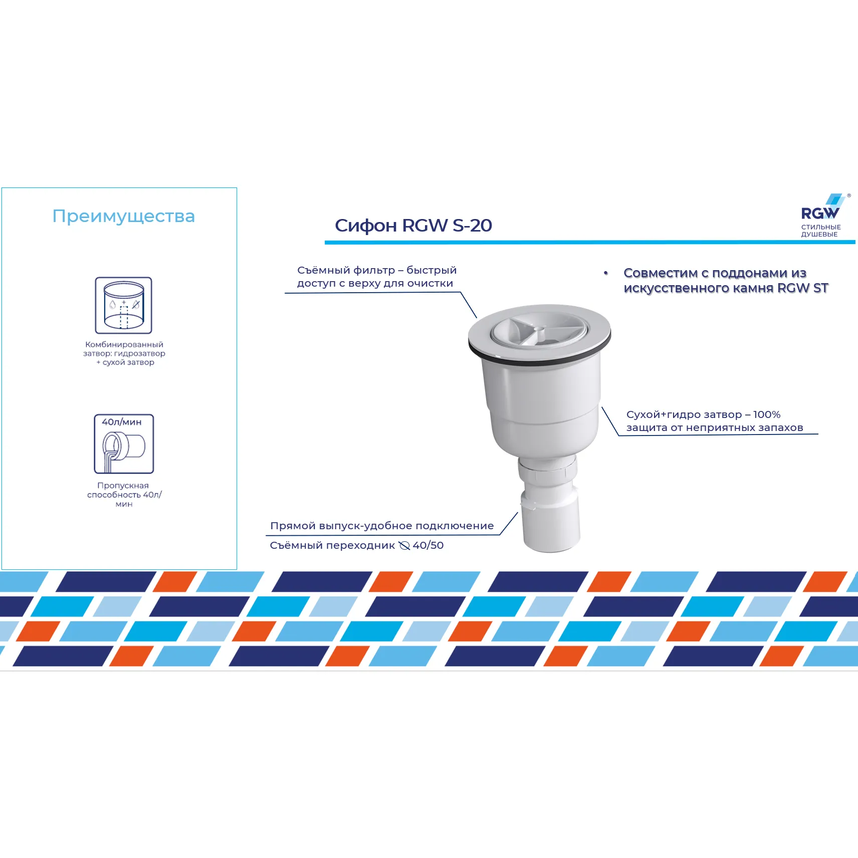 Сифон для поддонов из искусственного камня RGW ST с вертикальным сливом.