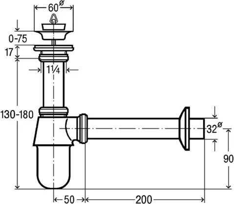 366681 Сифон для раковины (латунь), с пробкой, 1 1/4 x 32, хром, разъёмная чашка выпуска