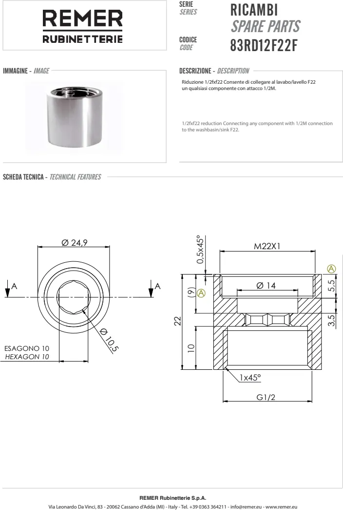 Переходник Remer 1/2"г*М22г 83RD12F22F