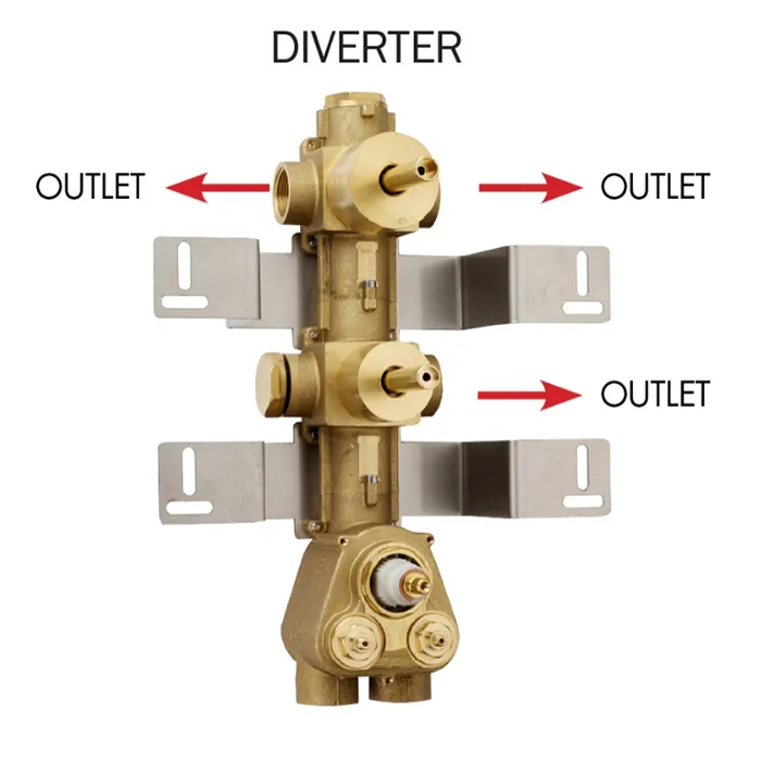 Деталь для встроенного монтажа, для термостатического смесителя, высокой пропускной способности на 3/4 ”, на 3 ВЫХОДА (С ДЕВИАТОРОМ 2 НАПРАВЛЕНИЯ и запорным вентилем), установка вертикальная/ горизонтальная