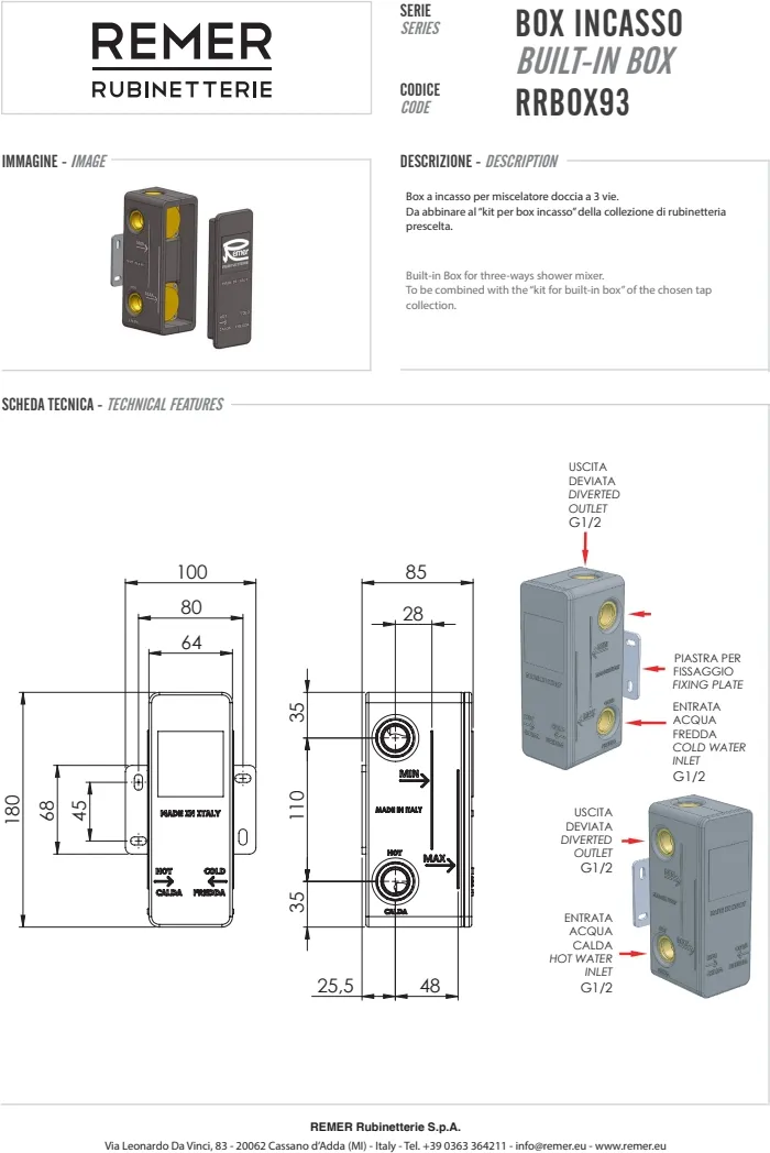 Итальянский бренд Remer Rubinetterie более 50 лет специализируется на выпуске смесителей, душевых систем и аксессуаров для ванной комнаты и кухни. Главная особенность продукции Remer — сочетание классического итальянского дизайна и современных технологий. В отличие от многих конкурентов, компания выпускает полный цикл изделий: от литейного производства латунных корпусов до хромирования и финальной сборки. Это обеспечивает стабильное качество, долговечность и оптимальную цену для европейской сантехники премиум-класса.