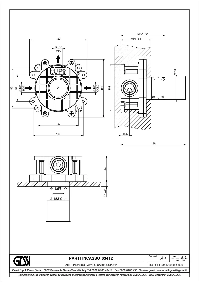 Внутренняя часть одноходовая настенного смесителя для раковины Gessi Parti Incasso 63412.239 выполнена в цвете сталь шлифованная.