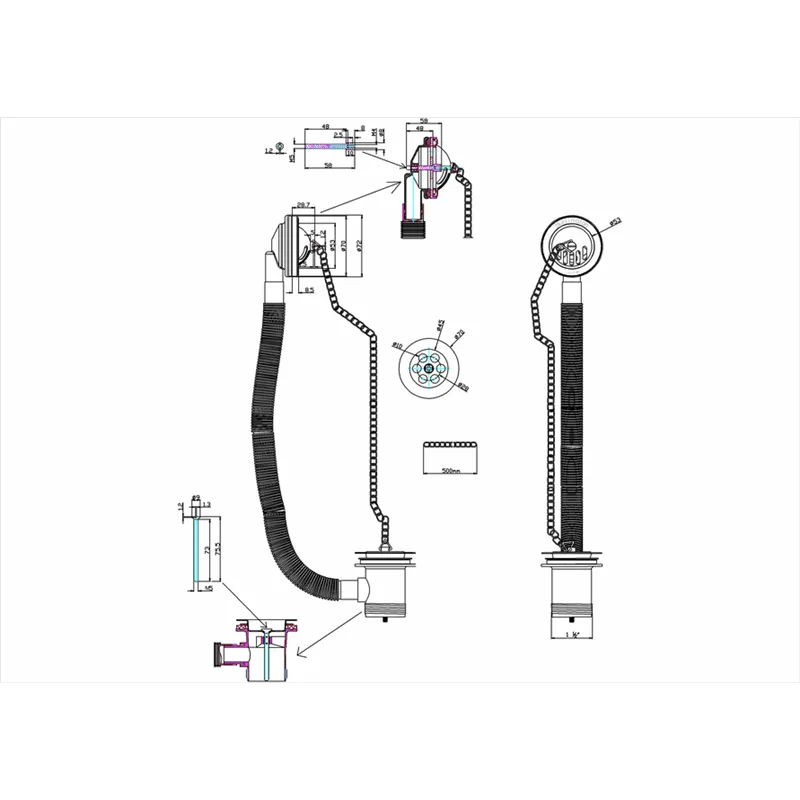 Металлический слив с переливом, укомплектованный пробкой и цепочкой, – надежное сантехническое оборудование с высокой пропускной способностью. Благодаря своему утонченному исполнению комплектующее станет гармоничной деталью в интерьере.