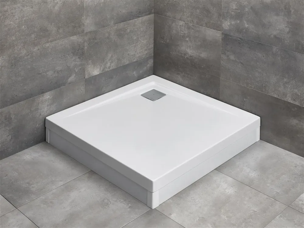 Квадратный плоский акриловый поддон с ножками в комплекте. Панель (из алюминия в белом либо хромированном цветах) покупается отдельно. Предназначенный для монтажа на ножках. Отверстие для сифона Ø90мм. Рекомендуемый сифон R399 — с квадратной крышкой.