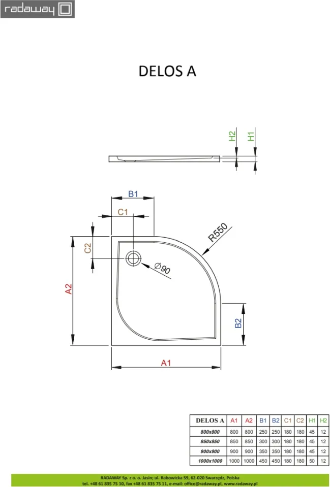 Плоский полукруглый акриловый поддон — радиус r=550мм. Предназначенный для монтажа без ножок — необходимо приклеить на строительный раствор или пену с низким коэффицентом расширения. Отверстие для сифона Ø90мм. Рекомендуемый сифон TB90, TB21, R500, R400 Slim.
