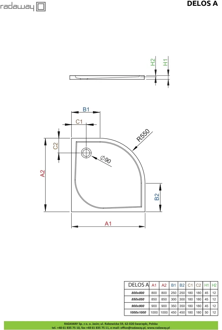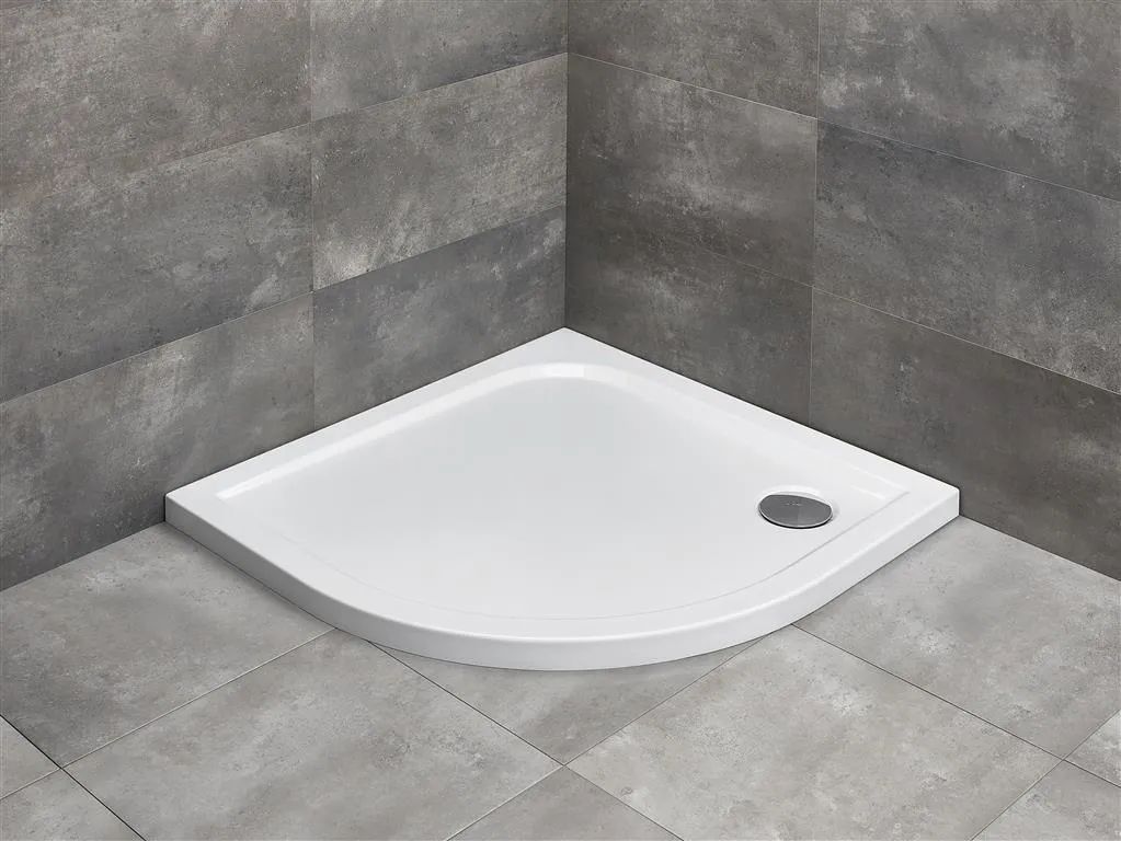 Плоский полукруглый акриловый поддон — радиус r=550мм. Предназначенный для монтажа без ножок — необходимо приклеить на строительный раствор или пену с низким коэффицентом расширения. Отверстие для сифона Ø90мм. Рекомендуемый сифон TB90, TB21, R500, R400 Slim.