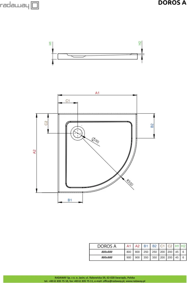 Плоский полукруглый акриловый поддон — радиус r=550мм. Предназначенный для монтажа без ножок — необходимо приклеить на строительный раствор или пену с низким коэффицентом расширения. Отверстие для сифона Ø90мм. Рекомендуемый сифон TB90, TB21, R500, R400 Slim.