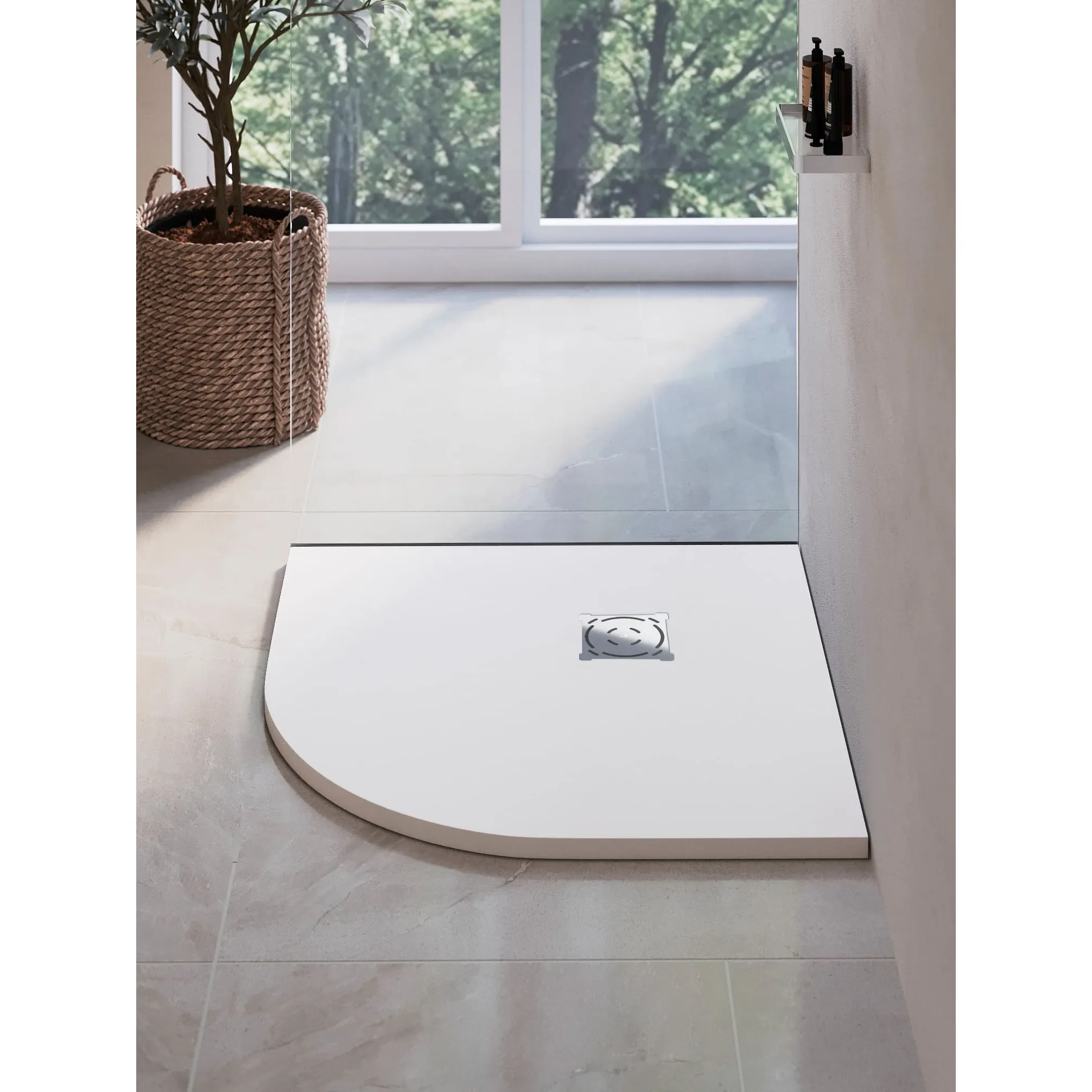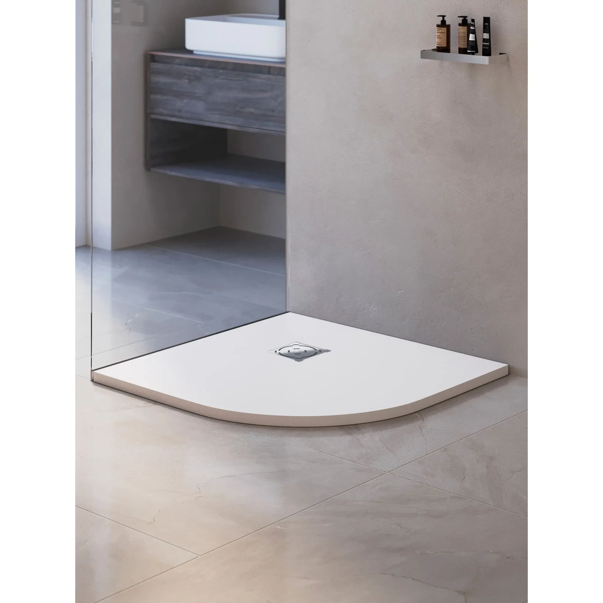 Новый поддон — это самостоятельный аксессуар вашей душевой. Универсальный цвет, откликающийся на уровень освещения, и текстура “под камень” идеально сочетаются с интерьерами от смелых лофт и хайтек до романтичного прованса, а решетка из нержавеющей стали, защищающая слив, создаст безупречный аккомпанемент душевым системам, а таком же оттенке.