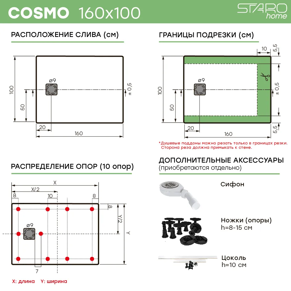 Душевой поддон StaroHome Solid размером 160х100 см выполнен из литьевого мрамора. Прямоугольная форма, поверхность — матовая, в белой расцветке. Идеально подходит для современных интерьеров ванных комнат.