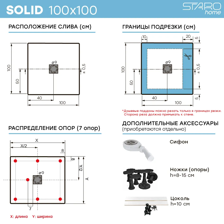 Душевой поддон StaroHome Solid размером 100х100 см выполнен из литьевого мрамора. Квадратная форма, поверхность — матовая, в чёрной расцветке. Идеально подходит для современных интерьеров ванных комнат.