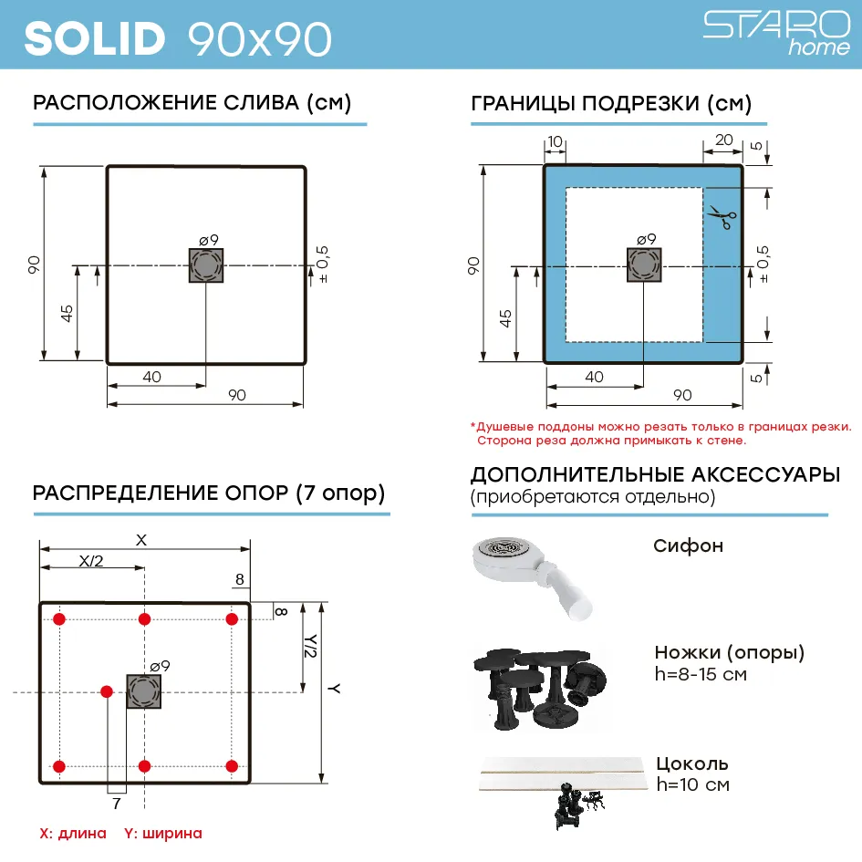 Душевой поддон StaroHome Solid размером 90х90 см выполнен из литьевого мрамора. Квадратная форма, поверхность — матовая, в белой расцветке. Идеально подходит для современных интерьеров ванных комнат.