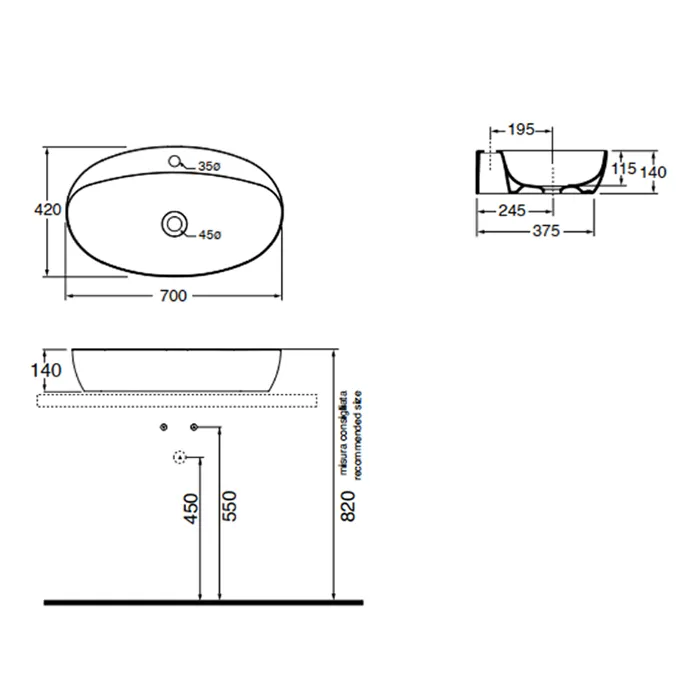Раковина накладная Azzurra Elegance Circle 70х42см с 1 отв. под смеситель, белый ELLA070420CMBI/(ECI70M bi)*1