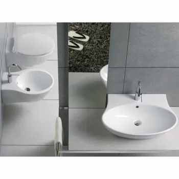 Раковина накладная HATRIA NIDO YXEP01, с 1 отверстием под смеситель (еще 2 отверстия намечены), с переливом, размер 68x48 см, цвет белый. Сифон, донный клапан и смеситель приобретаются отдельно.