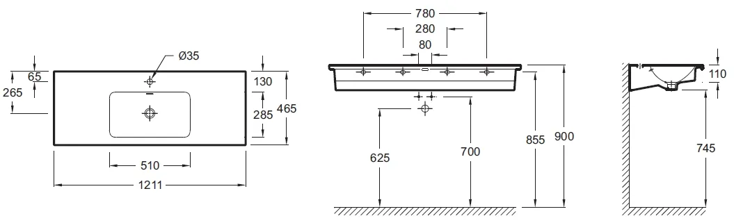Подвесная раковина-столешница с гладкой нижней поверхностью (для установки на мебель), 120 х 46 см.
