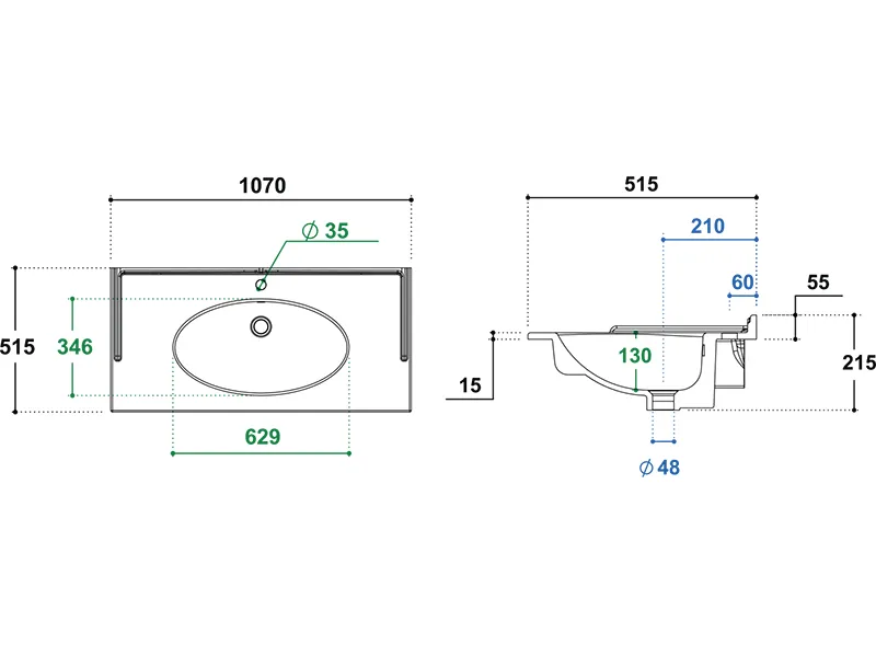 Раковина керамическая QUADRA VINTAGE 107х51,5 см, с 1 отверстием под смеситель, для тумбы SUVBS(2C/3C)107CRV цвет Polvere opaco. Продается только в комплекте с тумбой.